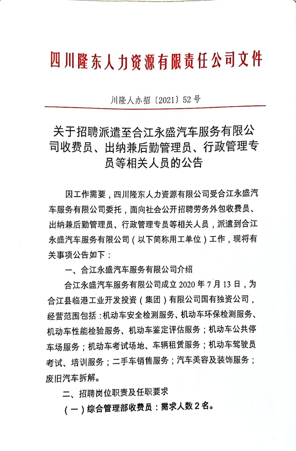 關(guān)于招聘派遣至合江永盛汽車服務(wù)有限公司收費(fèi)員、出納兼后勤管理員、行政管理專員等相關(guān)人員的公告
