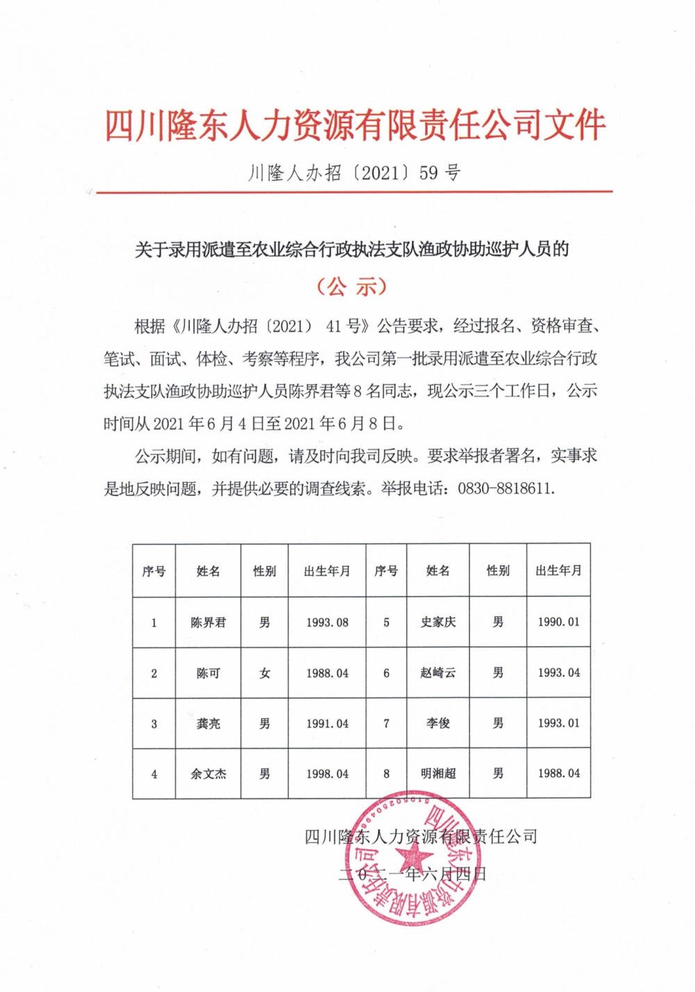關(guān)于錄用派遣至農(nóng)業(yè)綜合行政執(zhí)法支隊(duì)漁政協(xié)助巡護(hù)人員的(公 示)