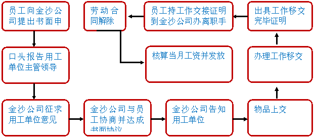 1、合同期內(nèi):員工提前30天,以書面形式向金沙公司提出辭職報告。