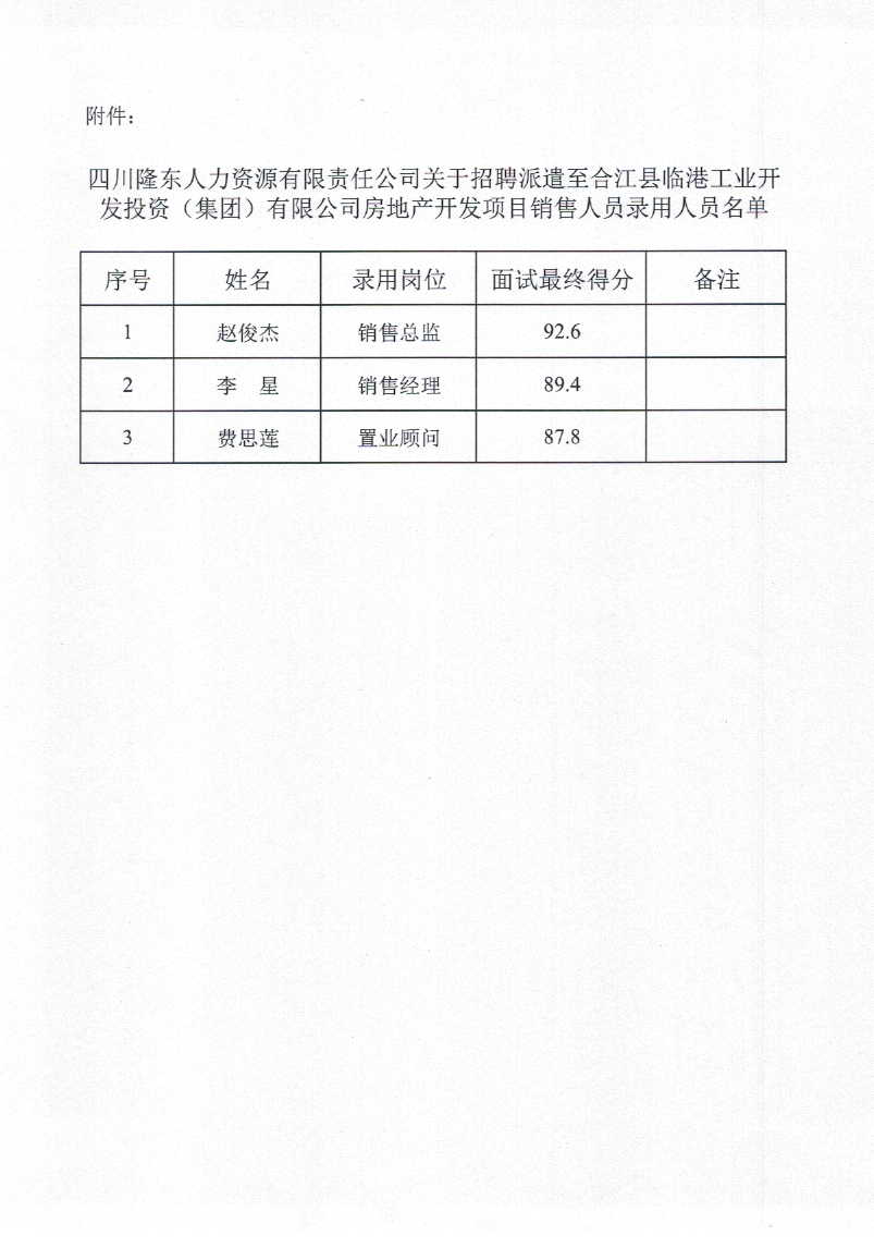 關(guān)于招聘派遣至合江縣臨港工業(yè)開發(fā)投資(集團)有限公司房地產(chǎn)開發(fā)項目銷售人員錄用的公示