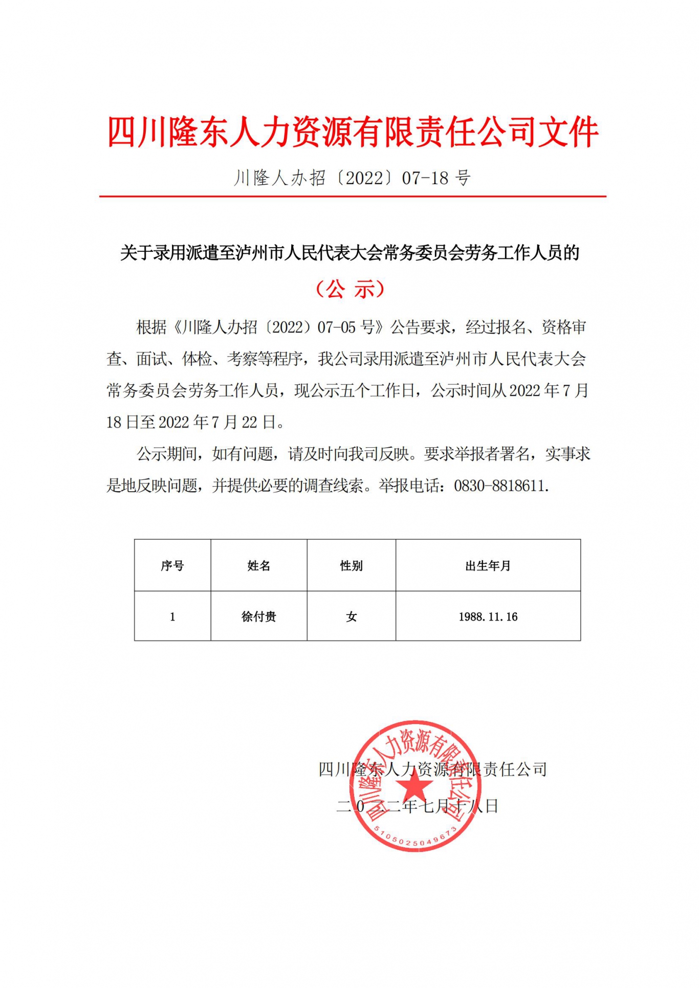 關(guān)于錄用派遣至瀘州市人民代表大會(huì)常務(wù)委員會(huì)勞務(wù)工作人員的 (公 示)