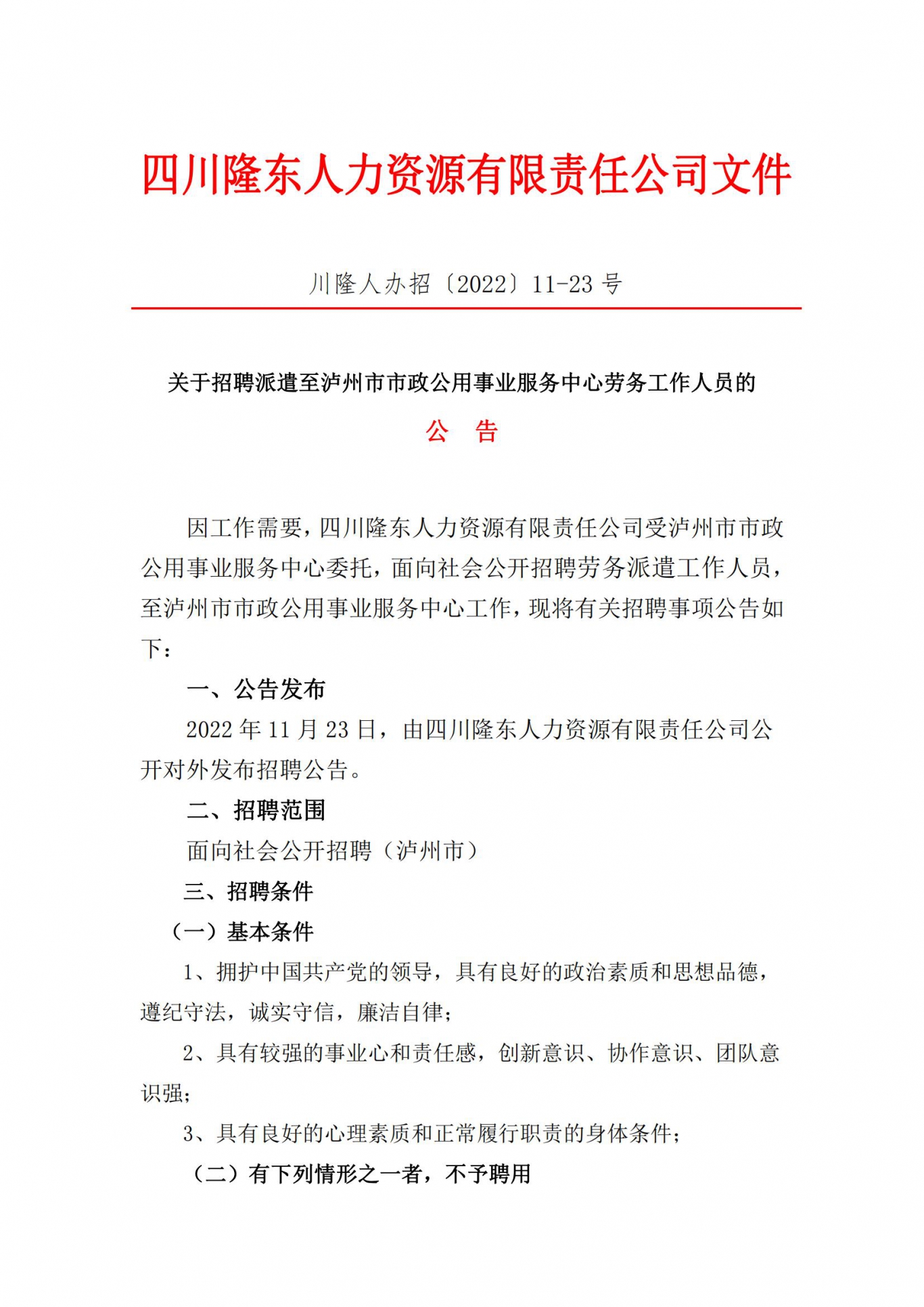 關(guān)于招聘派遣至瀘州市市政公用事業(yè)服務(wù)中心勞務(wù)工作人員的公告