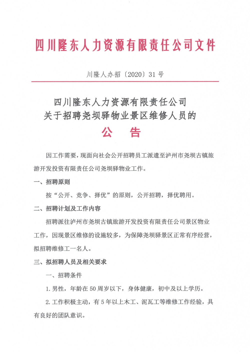 堯壩驛物業(yè)招聘維修人員的公告