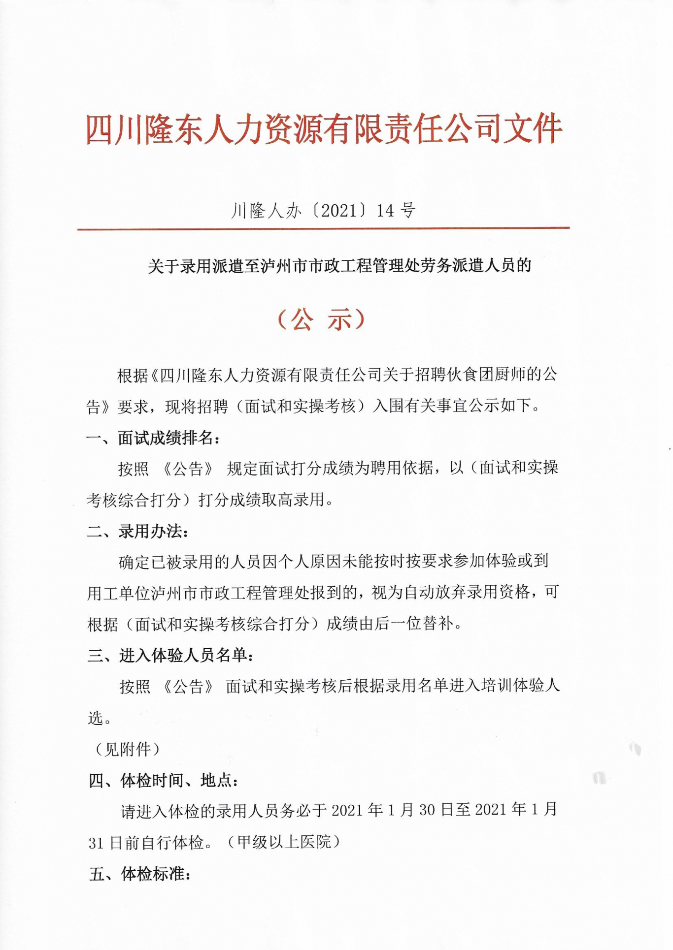 關(guān)于錄用派遣至瀘州市市政工程處勞務(wù)派遣人員的 (公 示)